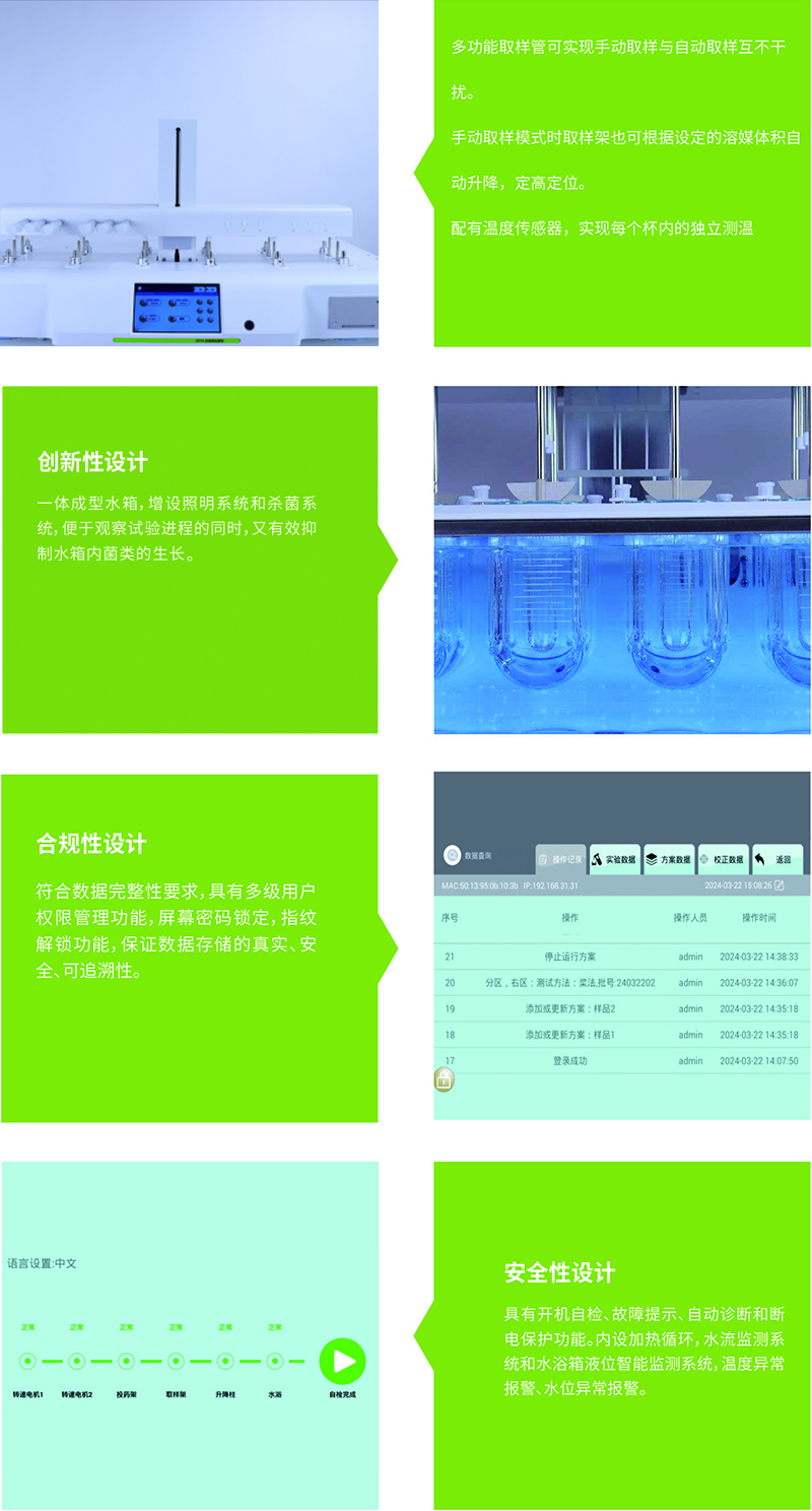 ● 高精度實時恒溫控制,每個溶出杯內(nèi)獨立測溫,并具有溫度校準(zhǔn)功能